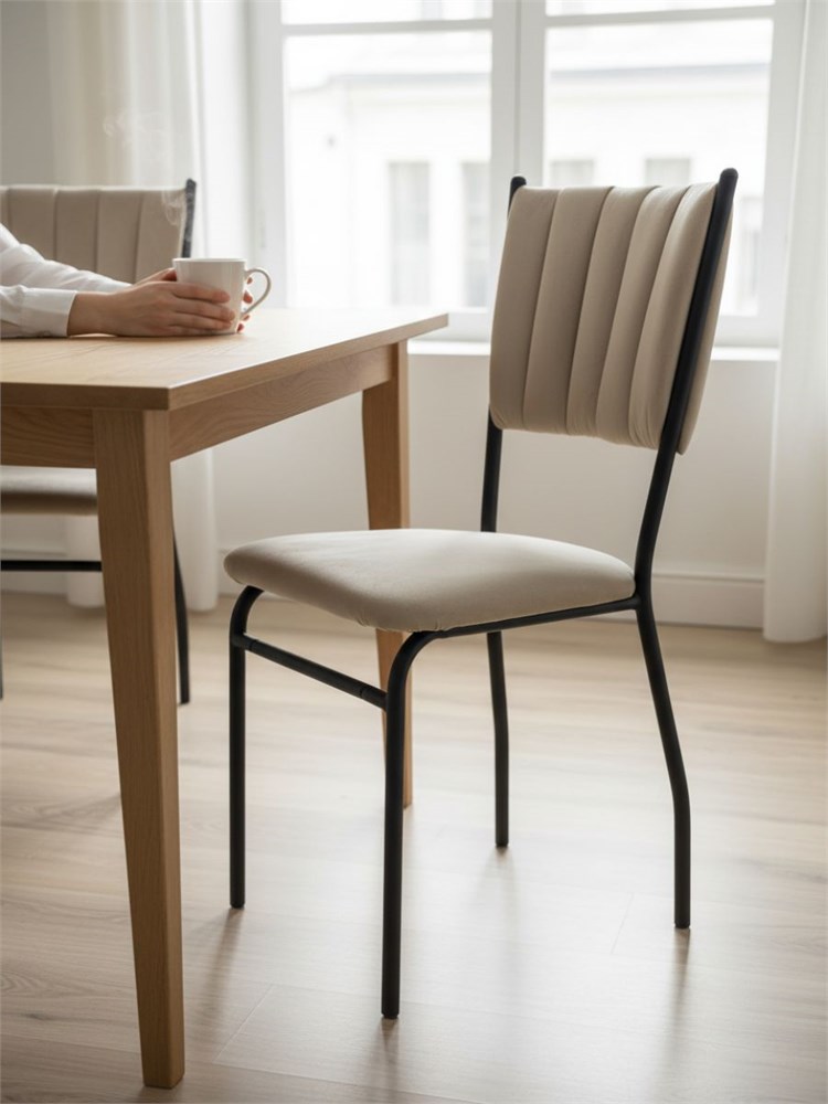 Стул кухонный "Камелот" с мягкой спинкой разборный New Victoria, велюр бежевый- Комфортная мягкая спинка и сиденье из плотного велюра обеспечивают приятные тактильные ощущения и долгий комфорт- Универсальное применение: идеально сочетается в интерьерах кухни, гостиной, дачи или ванной благодаря современному минималистичному дизайну- Легкая сборка без инструментов: компактная упаковка и четкие инструкции позволяют быстро подготовить изделие к использованию- Надежная металлическая основа с матовым покрытием выдерживает нагрузку до 100 кг, обеспечивая долговечность конструкции- Бежевый велюр легко впишется в любой интерьер, а гарантия на год дает уверенность в качестве фабричного производства